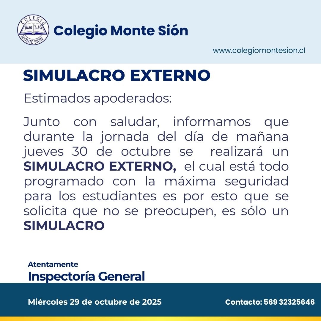 Escuela para padresEstimada Comunidad Monte Sión: Junto con saludar, les informamos que el día martes 08 de abril damos inicio a nuestra escuela para padres, madres y apoderados, la cual se desarrollará en dos horarios, 08:15 y 15:30 horas, todos los días martes. Esta es una gran oportunidad para adquirir herramientas en beneficio de sus hijos e hijas, es por esto que esperamos contar con su participación.