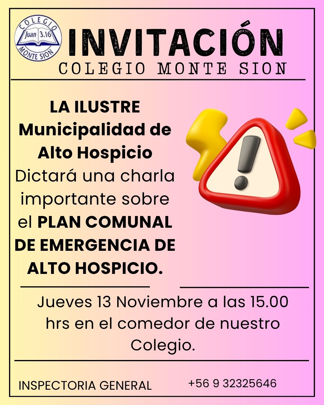 Taller para apoderados de 1º año básicoEstimada Comunidad Monte Sión: El equipo de Convivencia Escolar junto a la Profesora jefe de 1º básico Srta. Nicole Castillo Tapia, le invitan a una sesión de psicoeducación dirigida especialmente a los padres, madres y cuidadores de 1º básico. Sabemos que el desarrollo sano e integral de su estudiante es una prioridad para usted, por tanto ,esperamos contar con su participación.