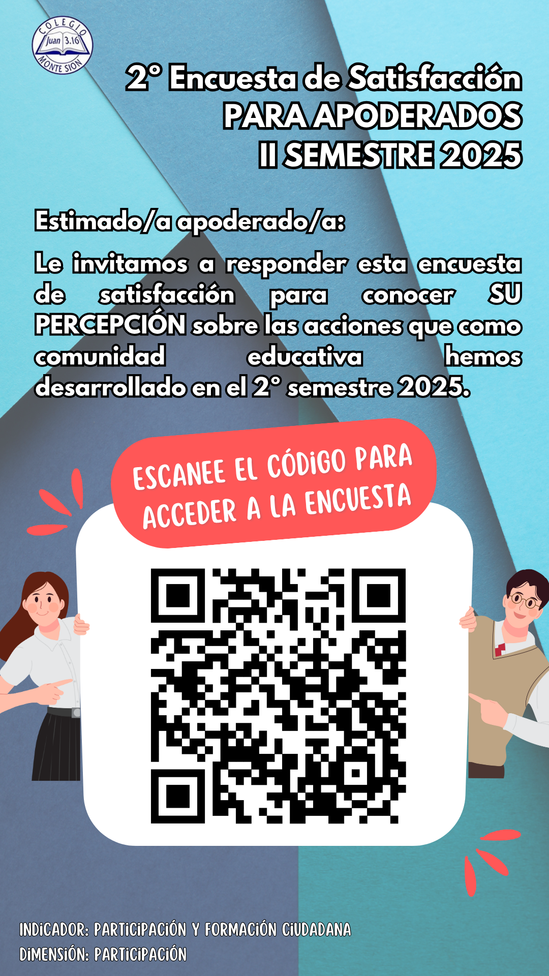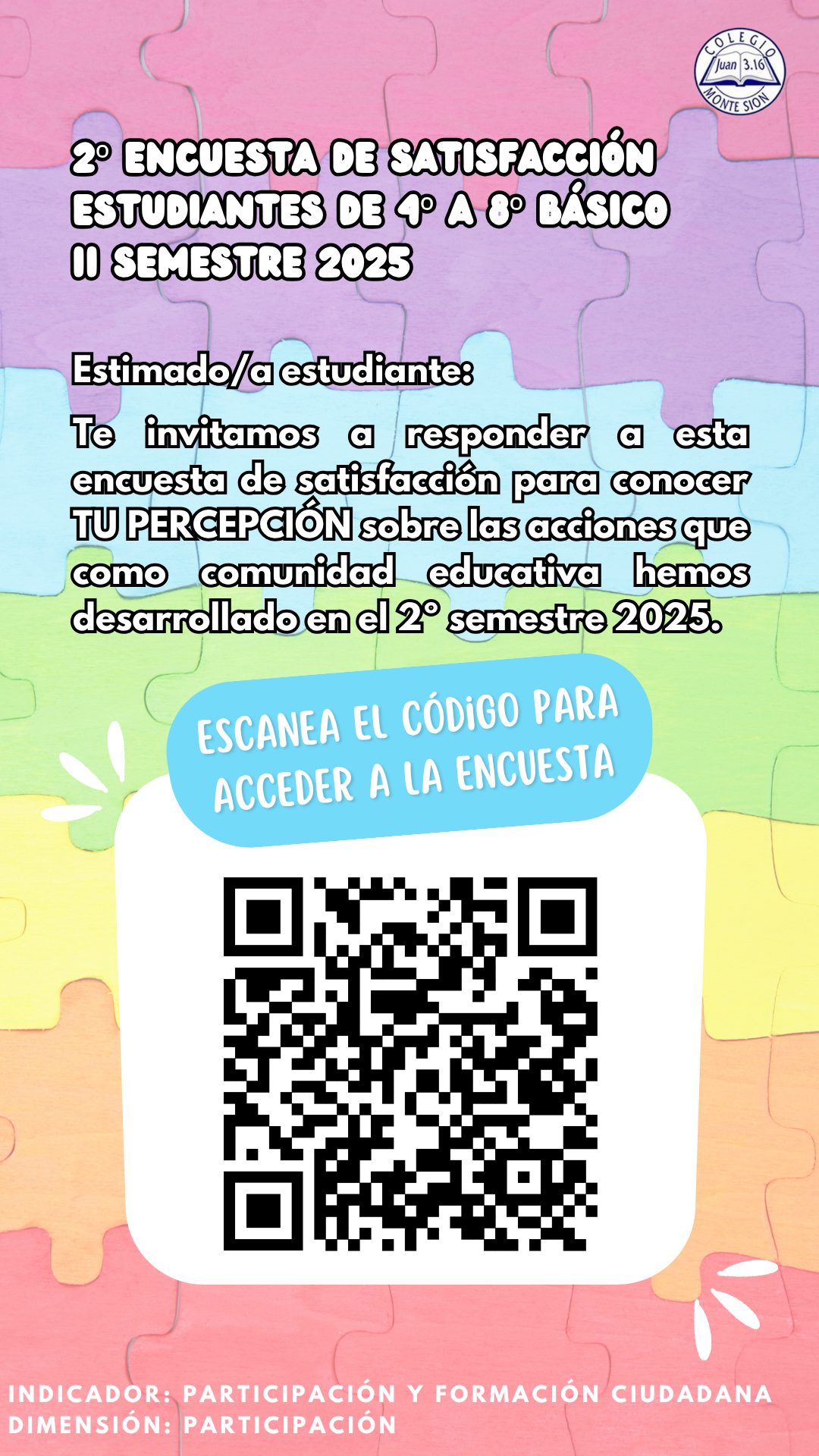 Segunda encuesta de satisfacción para padres, madres y apoderados - estudiantes de 4° a 8° básicoEstimada Comunidad Monte Sión: Junto con saludar, le invitamos a usted y a su estudiante a completar la encuesta de satisfacción correspondiente al II semestre del 2025. A continuación, encontrará 2 códigos QR que, al escanearlos con su celular, le dirigirán a las encuestas, las cuales debe responder y enviar sólo una vez. Además, al final de esta publicación encontrará los enlaces que también le dirigirán a las encuestas. La participación de nuestros apoderados y estudiantes es de gran importancia, ya que la información que se recoja nos permitirá seguir fortaleciendo nuestras acciones como comunidad educativa.