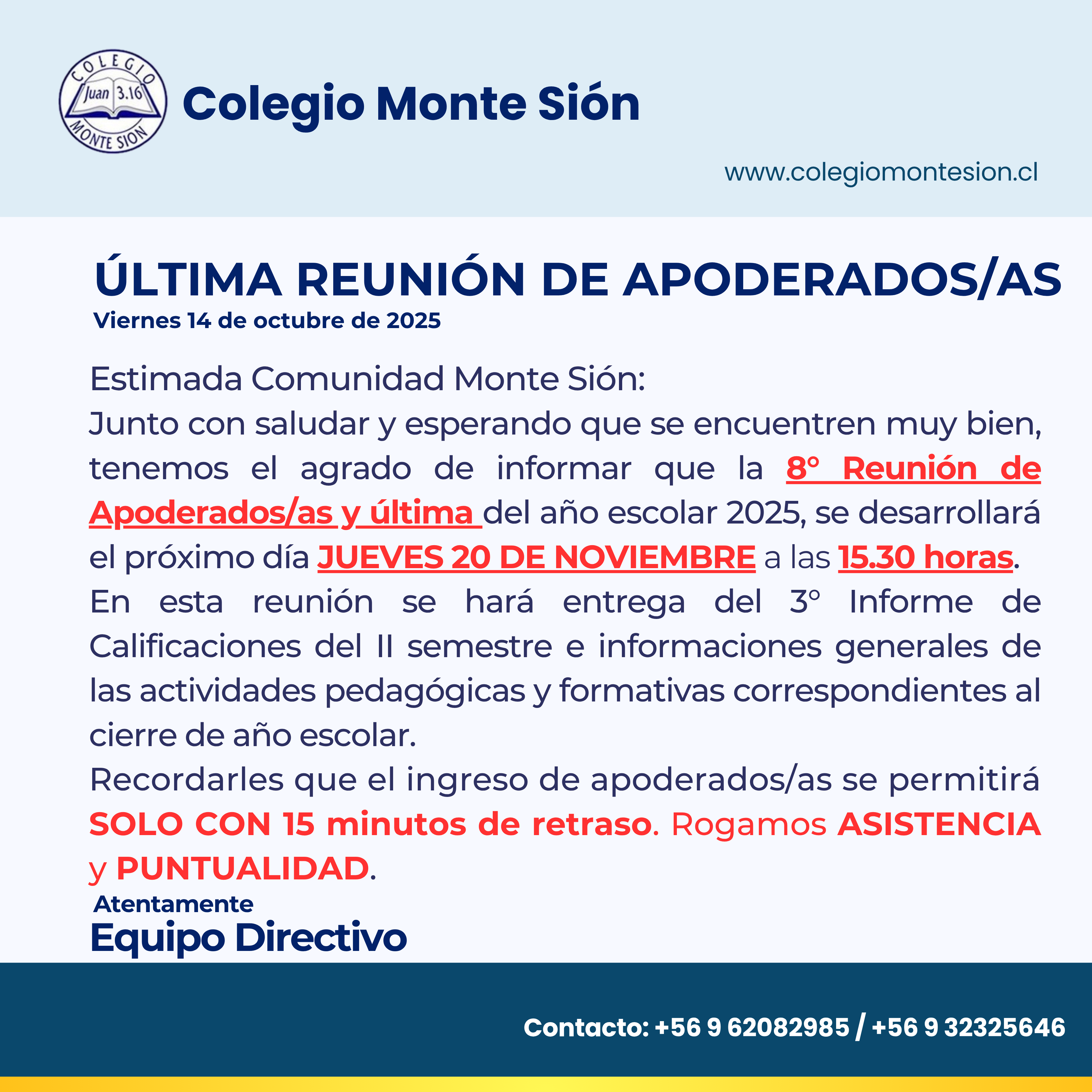 Escuela para padresEstimada Comunidad Monte Sión: Junto con saludar, les informamos que el día martes 08 de abril damos inicio a nuestra escuela para padres, madres y apoderados, la cual se desarrollará en dos horarios, 08:15 y 15:30 horas, todos los días martes. Esta es una gran oportunidad para adquirir herramientas en beneficio de sus hijos e hijas, es por esto que esperamos contar con su participación.