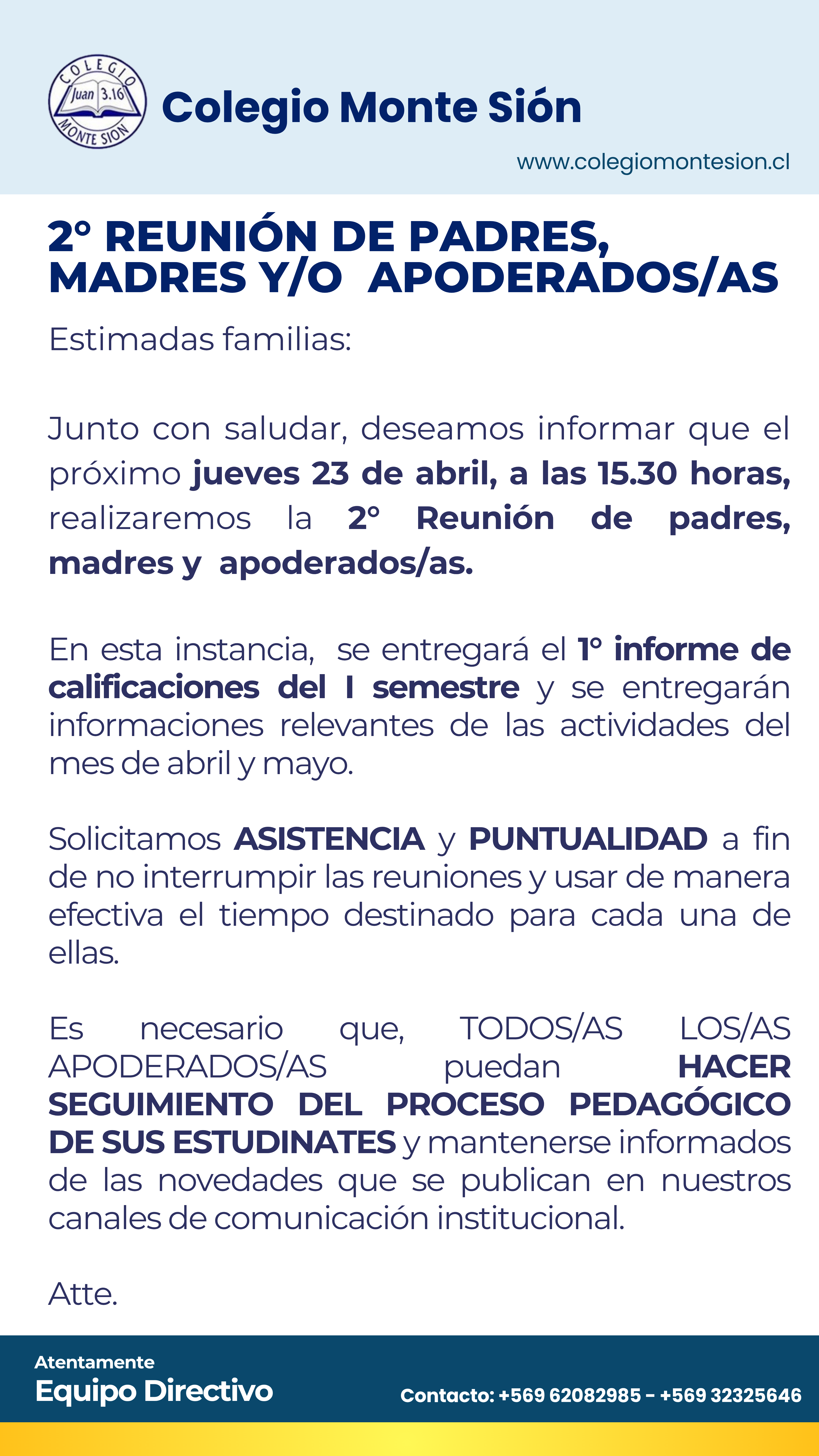 Comunicado Nro. 2Estimada Comunidad Educativa Monte Sion: Junto con saludarles cordialmente y esperando que cada una de sus familias se encuentre bien y bendecida por Dios, nos dirigimos a ustedes para informar los últimos acontecimientos ocurridos durante esta semana. Lamentamos enormemente que esto se haya vuelto una rutina para nuestros estudiantes, sin identificar cuales son los verdaderos motivos de dichos actos, lo que es muy probable que sólo se deba a la intención de que las clases sean suspendidas. El día de ayer y hoy, producto de los rayados encontrados, hemos realizado las denuncias correspondientes con carabineros de chile y policía de investigaciones, por lo que hemos ratificado que aquellos involucrados tendrán consecuencias ejemplificadoras por utilizar valiosos recursos del estado y perjudicar el buen funcionamiento de nuestro establecimiento. Ante esta situación, debemos informar que no serán suspendidas las clases regulares, sin embargo, las medidas de control serán duplicadas para hallar al o los responsables de exponer a toda nuestra comunidad a sentimientos de inseguridad y amenaza. Asi mismo, cada familia tiene libertad de tomar la decisión de enviar o no a sus hijos/as a clases durante los próximos días. Seguiremos llamando a la calma porque las acciones preventivas han permitido que la rutina pedagógica de todos nuestros estudiantes se mantenga de manera regular. A continuación, detallamos todas las acciones que se han realizado y acordado para establecer un mayor control y asegurar el bienestar de todos los miembros de nuestra comunidad: